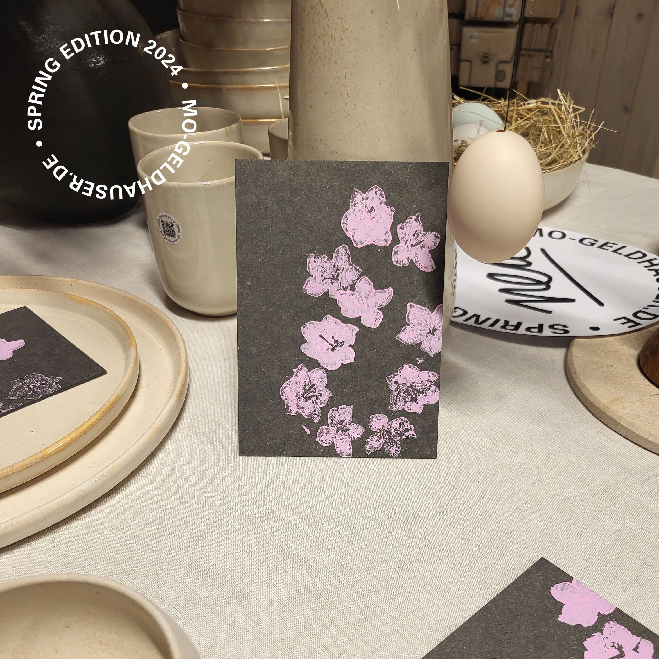 Den Grundstoff der Kartonage beziehe ich von Herrn Wölfel, dem Kartonagenfabrikanten aus Nürnberg, welcher mir die Karten zuschneidet. Die Grafik zur edition SPRING 2024 habe ich gezeichnet und mir verschiedene Stempel erstellen lassen. Sie lebt von der Einfachheit der Kirschblüte. Das Besondere ist die Stärke der Karte. Sie wirkt dadurch sehr selbstbewusst und ein Umschlag zum Überreichen ist nicht nötig.
